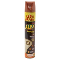 Renovador de muebles marca ALEX. Cuidado extra. Sin rastro no graso. Da brillo. Renueva el color y el aspecto. Reduce 90% de los alérgenos. Contiene 400 ml + 100 ml. Con aroma a notas frutales de naranja. Alex atrapa polvo cuidado. Reduce el 90% de los alégenos de polen y ácaros.