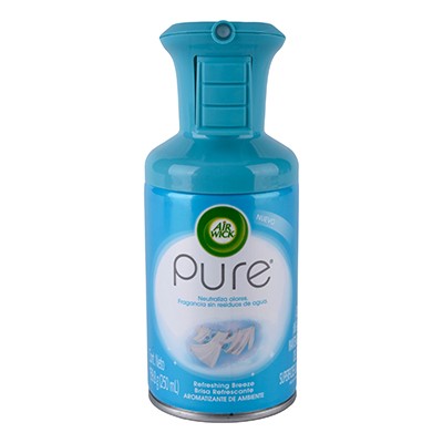 Aromatizante en Aerosol Air Wick Pure Brisa Refrescante de 250 mililitros, neutraliza los olores desagradables sin dejar residuos de agua, invadiendo de una fresca y placentera fragancia el ambiente en el que se utilice. Su diseño cuenta con dispersor de gatillo que permite emplearlo fácilmente en espacios como baño, cocina, estudio o dormitorio. La fórmula con la que está elaborado actúa de manera instantánea para evitar que los malos olores se hagan presentes, sin dejar residuos al caer en las superficies.