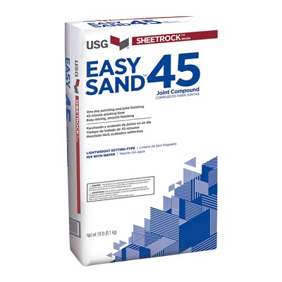 Compuesto Easy Sand 45 ( 384210 – 601 ). Estos compuestos son ideales para rellenos excesivos y lijan con facilidad lo que permite un acabado rápido y suave. Los compuestos ligeros para Juntas Tipo Fraguado Easy Sand marca SHEETROCK pueden utilizarse para una variedad de aplicaciones que incluyen: llenar suavizar y acabar los cielos rasos de cemento de interior y cemento de nivel superior aprovechar y acabar los paneles en zonas de baños y acabar las juntas en sofitos protegidos del exterior. Saco de 8.1kg