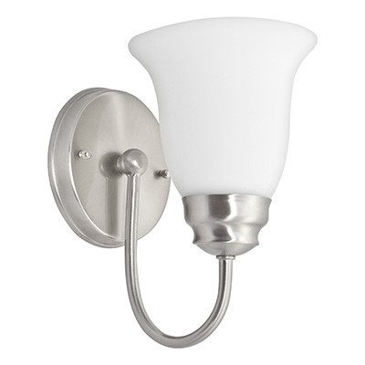 Lámpara de interior para pared. Base en Níquel con acabado satinado. Pantalla de vidrio escarchado color Blanco. 1 luz. Entrada E27. Preferente se utiliza en baños. Pasillos. Escaleras o pared. Utiliza un foco de 60 watts no incluido. Fácil de instalar.