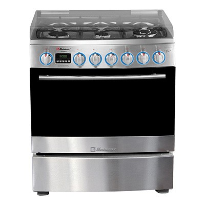 Estufa Koblenz con cubierta de acero inoxidable para montaje en piso y con encendido automático en quemadores y horno. Tiene una puerta con capelo recto de cristal templado; su diseño SanftGlas evita que se azote y cuenta con una cubierta de cerámica que brinda una vista panorámica de los alimentos, mientas su horno color azul Blulnnové ofrece una máxima capacidad y mayor limpieza. Contiene luz en su interior, termostato, 2 parrillas deslizables y una jaladera Luxlnox. Además, 6 quemadores 1 triple flama QuickBurner, 1 jumbo Superburner y 4 estándar que se activan con perillas iluminadas Shinycontrol tipo Gourmet y un display que Pushcontrol que permite ver un reloj digital. Por su avanzada tecnología, permite un funcionamiento convertible del tipo de gas y posee una certificación para uso doméstico. Sus dimensiones son 97 cm de altura x 76 cm de ancho con un profundo de 64 cm.