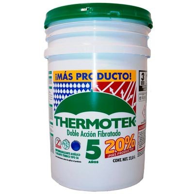 THERMOTEK DOBLE ACCIÓN. Impermeabilizante y aislante térmico acrílico elastomérico en emulsión acuosa de aplicación en frío. Elaborado con resinas estiren – acrílicas que brindan excelentes características de adherencia elasticidad y durabilidad con cargas de partículas cerámicas de gran resistencia a la conductividad térmica confiriéndole características de reflectividad y aislamiento térmico. THERMOTEK DOBLE ACCIÓN se usa como recubrimiento impermeable y decorativo en techos de concreto. asbesto-cemento. entre otros. en casas habitación. hoteles. fábricas. bodegas. etc.
