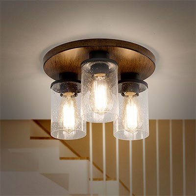 Lámpara de techo de 3 luces en acabado bronce aceitado con pantalla de vidrio burbuja. Utiliza 3 focos e26 de 60w (máx) no incluidos.