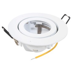 Luminario empotrado orientable para uso interior, acabado blanco. Diámetro de la ranura de 9.2 cm. Lámpara halógena (no incluida) 1 x 50W total. Las lámparas requieren transformador o driver (no incluido). Instalación en caja cuadrada, bote integral o falso plafón. Base GU5.3, entrada MR16. Modelo 19011-0.