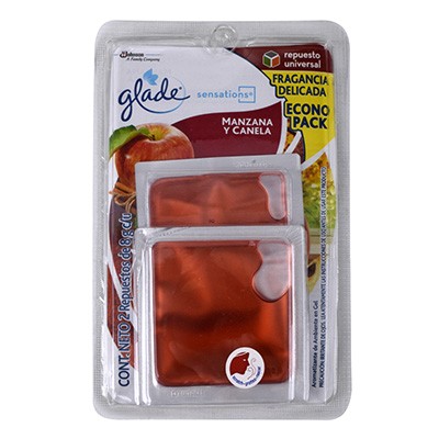 Repuesto Aromatizante Glade Sensations en gel con aroma duradero hasta por 60 días a Manzana y Canela que actúa rápidamente eliminando los olores desagradables de forma continua. Ideal para colocarlo en espacios pequeños como salas, comedores, estudios o autos. Sus láminas de gel contienen notas de fragancia que complementan la sensación de limpieza. El econopack incluye 2 piezas de 8 gramos cada una que se pueden emplear en cualquier aparato de la línea Sensations o solos.