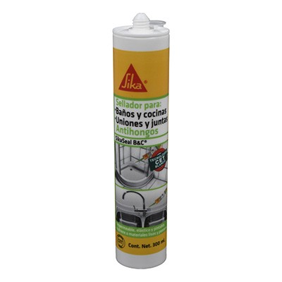 Sellador para baños y cocinas Sika SikaSeal B&C blanco 300 ml, cuenta con una fórmula elasto – plástica con base en tecnología CET hibrida y fungicida. Brinda gran adherencia en juntas de áreas frías, su uso es recomendado para uniones y conexiones entre azulejos, cerámicos, concreto, mortero, aluminio, vidrio, muebles y accesorios sanitarios. Seca al tacto en tan sólo 20 minutos para una velocidad de curado total de 24 horas.