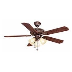 Ventilador de techo marca Hampton Bay. Acabado de bronce antiguo y 5 aspas de roble/nogal oscuro reversibles para un diseño que complementa a la perfección diferentes estilos de decoración para el hogar. El ventilador ofrece un motor reversible de 3 velocidades para que pueda controlar fácilmente la velocidad y el flujo de aire; y el multi-condensador permite que su funcionamiento sea Silencioso. El kit de 3 luces viene con la pantalla de vidrio en color ámbar claro y utiliza tres bombillas CFL de 13 watts. Excelente para usarse en habitaciones grandes de hasta 20 pies cuadrados. Diseñado para usarse únicamente en interiores.